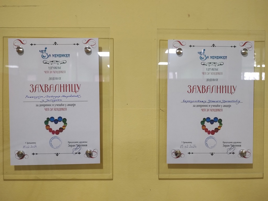Удружење "Чеп за хендикеп",чији је председник господин Зоран Мартинов, послало је недавно и две захвалнице на адресу Јагодинске гимназије, да би се на симболичан начин одужило за успешну вишегодишњу сарадњу. Једна захвалница је насловљена на школу, а друга на вероучитеља Угљешу Урошевића, који свих ових година предано координише овом акцијом. Захвалнице су урамљене и истакнуте у холу школе да сведоче о овој сарадњи, као и да нас подстакну да будемо још бољи у овој друштвенокорисној и душекорисној пракси.